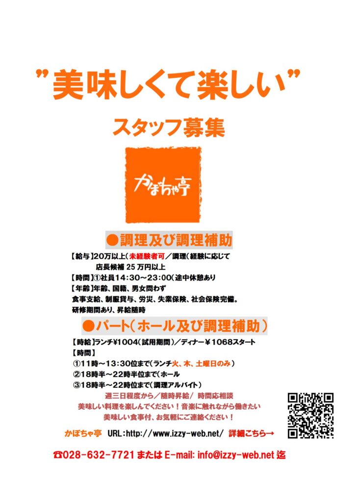 かぼちゃ亭ではホールスタッフ及び調理スタッフを募集しています。